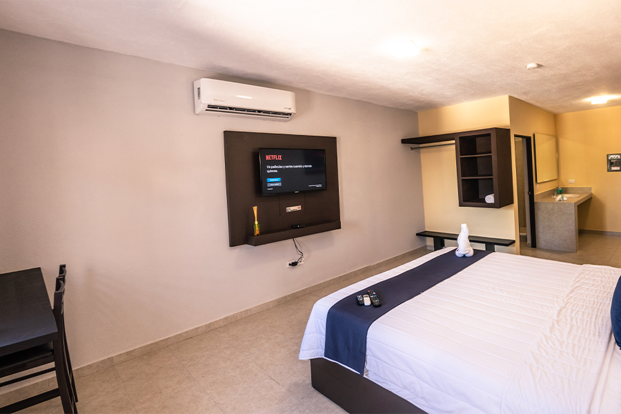 Las habitaciones sencillas, tranquilas y perfectamente equipadas; disponen de una cama king, baño completo, acceso gratuito a Internet WIFI, Smart TV. Recepción abierta las 24 horas.